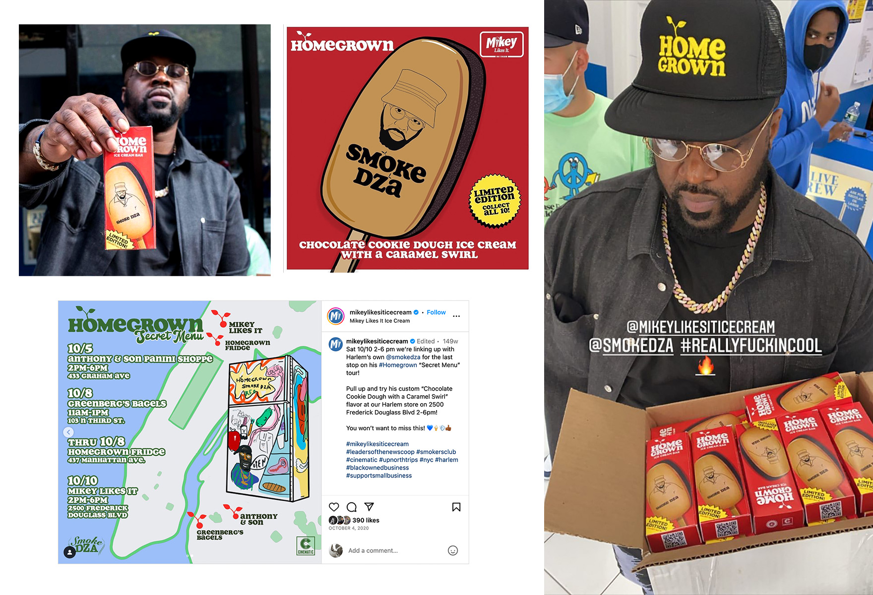 Design + direction for Smoke Dza’s “Homegrown” release, including collaborative Community fridges located in Harlem with NYC based artist Hidji World, collaborative Mikey Likes It Ice Cream NYC pop-up event with branded ice cream bars, NYC OOH campaign, interactive fridge webshop, vinyl, and full merchandise capsule.